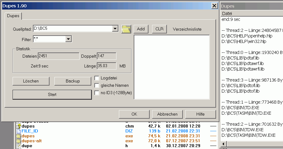 Dupes sucht in dem angegebenen Verzeichnis/Laufwerk nach identischen Dateien und bietet die Möglichkeit die identischen Dateien zu Löschen oder zu Archivieren