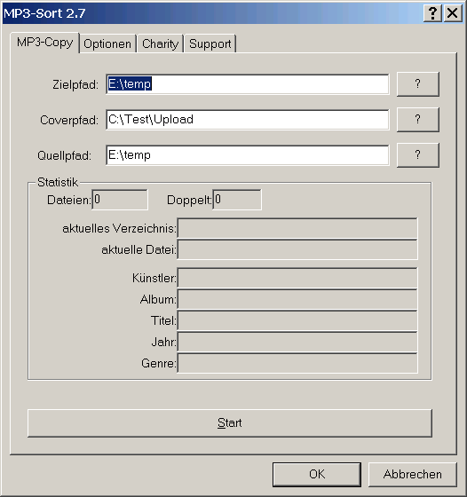 1. Künstler: Falls Informationen über einen Künstler im ID3-Tag stehen, wird in diesem Verzeichnis ein neues Verzeichnis angelegt, das den Namen des Künstlers trägt. Falls weiter noch Informationen über ein Album im ID3-Tag stehen, wird in diesem Verzeichnis ein neues Verzeichnis angelegt, das den Namen des Albums trägt. In dieses neue Verzeichnis kopiert MP3-Sort die Datei mit dem Namen, der in der Titelinformation steht. Ist keine Titelinformation vorhanden, so wird der ursprüngliche Name genommen.