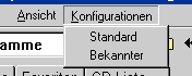 Dieser Menüpunkt dient zum Speichern der aktuellen Konfiguration unter einem frei wählbaren Namen. Wählt man diesen Menüpunkt, so wird man nach dem Dateinamen gefragt, unter dem man die aktuelle Konfiguration abspeichern möchte. Wenn man die Konfigurationen als <Name>.INI in das Programmverzeichnis von Kat-CeDe abspeichert, so erhält man beim nächsten Start einen zusätzlichen Menüpunkt „Konfigurationen“ der z.,B. so aussehen kann: