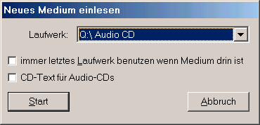 Aktiviert man die Checkbox mit dem Titel „immer letztes Laufwerk benutzen, wenn CD drin ist“, so merkt sich Kat-CeDe das letzte Laufwerk und wenn man erneut eine CD einlesen möchte, so wird zuerst dieses Laufwerk auf ein Medium untersucht. Befindet sich im zuletzt benutzen Laufwerk ein Medium, so beginnt Kat-CeDe ohne diese Dialogbox mit dem Einlesevorgang. Mit der Tastenkombination Shift+F2 kann man diese Dialogbox in jedem Fall zum Erscheinen bringen und diese Option wieder deaktivieren. Wenn der Punkt „CD-Text für Audio-CDs“ aktiviert ist versucht Kat-CeDe auch eventuell vorhandene CD-Text Informationen direkt von der CD einzulesen.